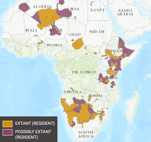 Figure 3. Geographic range of the cheetah (Acinonyx jubatus) in Africa (IUCN Red List of Threatened Species).